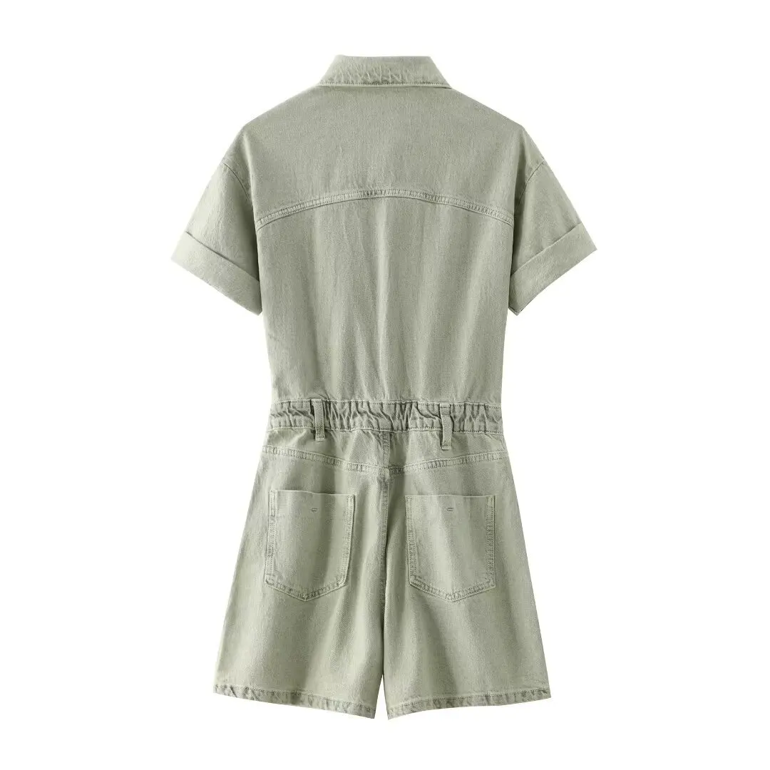 Combinaison salopette short en jean vert claire kaki (denim) pour femme, un incontournable estival