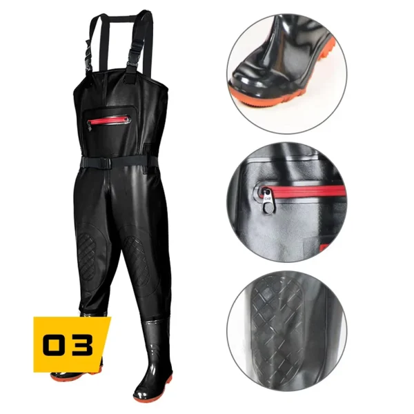La salopette de pêche noir avec botte étanche imperméable est conçue pour ceux qui bravent les environnements aquatiques les plus exigeants. Offrant une résistance inégalée à l’eau, ce vêtement assure que vous restiez au sec et à l’aise, que vous soyez au milieu d’un lac ou sous une pluie battante, tout en restant élégant.