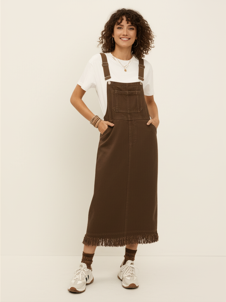 Salopette robe (jupe longue) marron en jean pour un style chic
