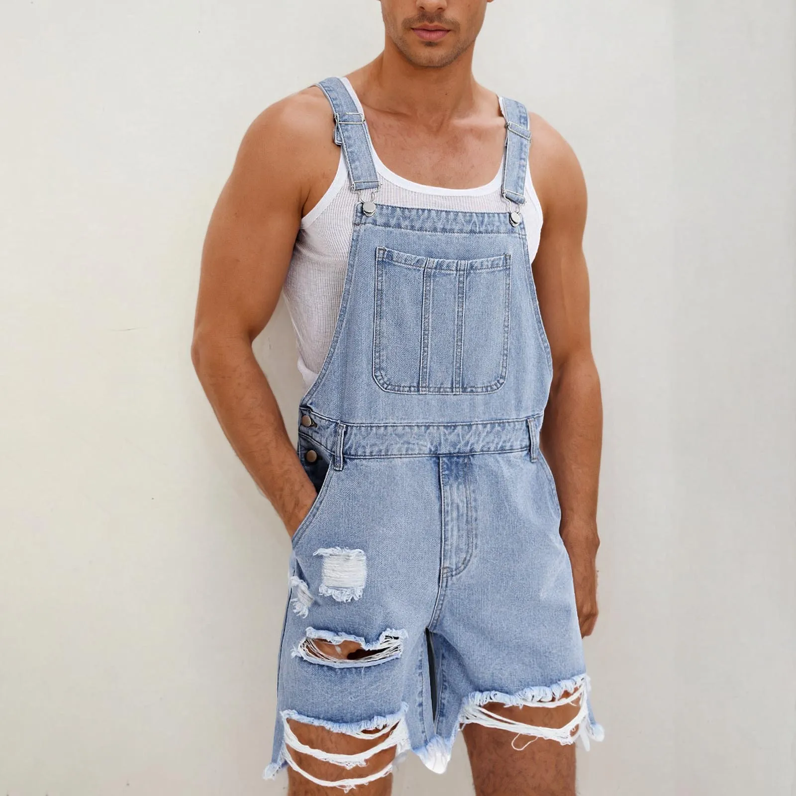 La polyvalence de la Salopette short en jean délavé bleu claire (demin) déchire à bretelle pour chaque occasion